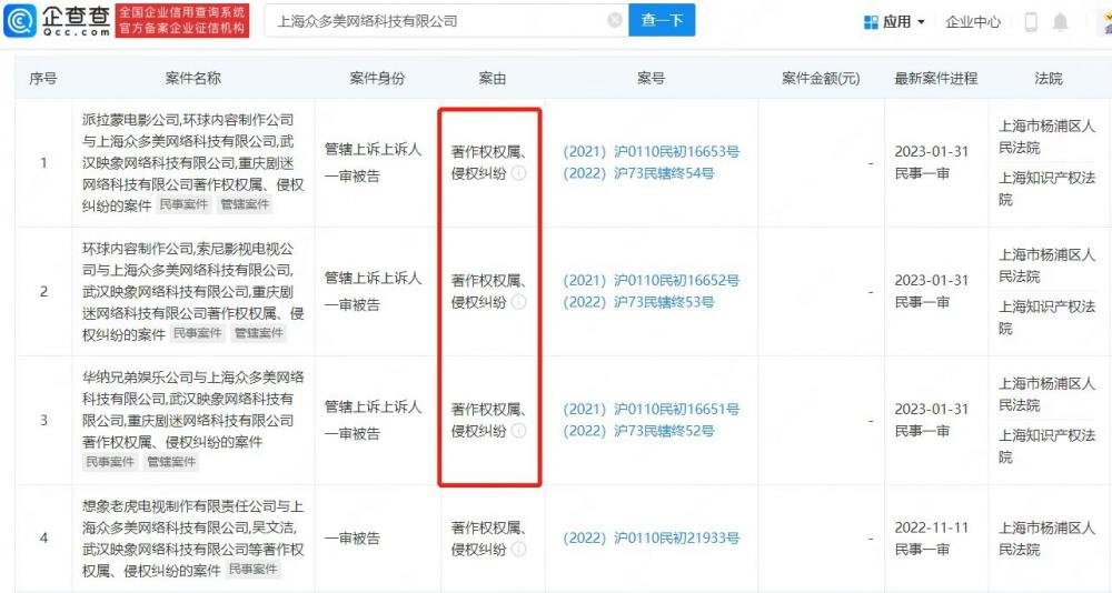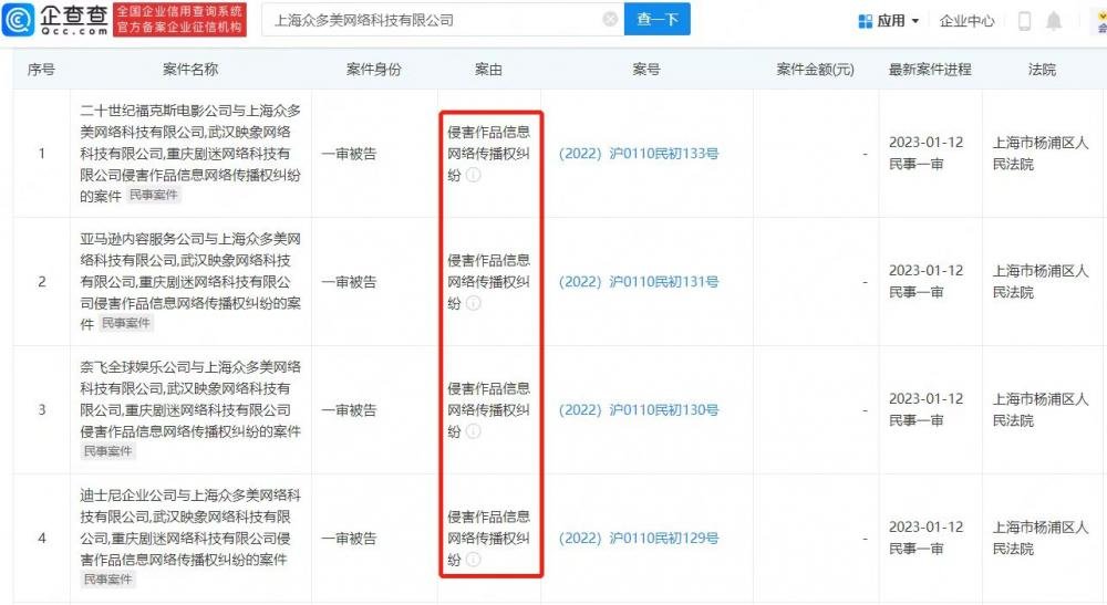 近期,人人视频关联主体公司上海众多美网络科技有限公司新增多个开庭公告,案由涉及“著作权权属、侵权纠纷,侵害作品信息网络传播权纠纷”,原告方包括:环球内容制作公司、索尼影视电视公司、华纳兄弟娱乐公司、二十世纪福克斯电影公司、奈飞全球娱乐公司、迪士尼企业公司等多家海外影视公司。