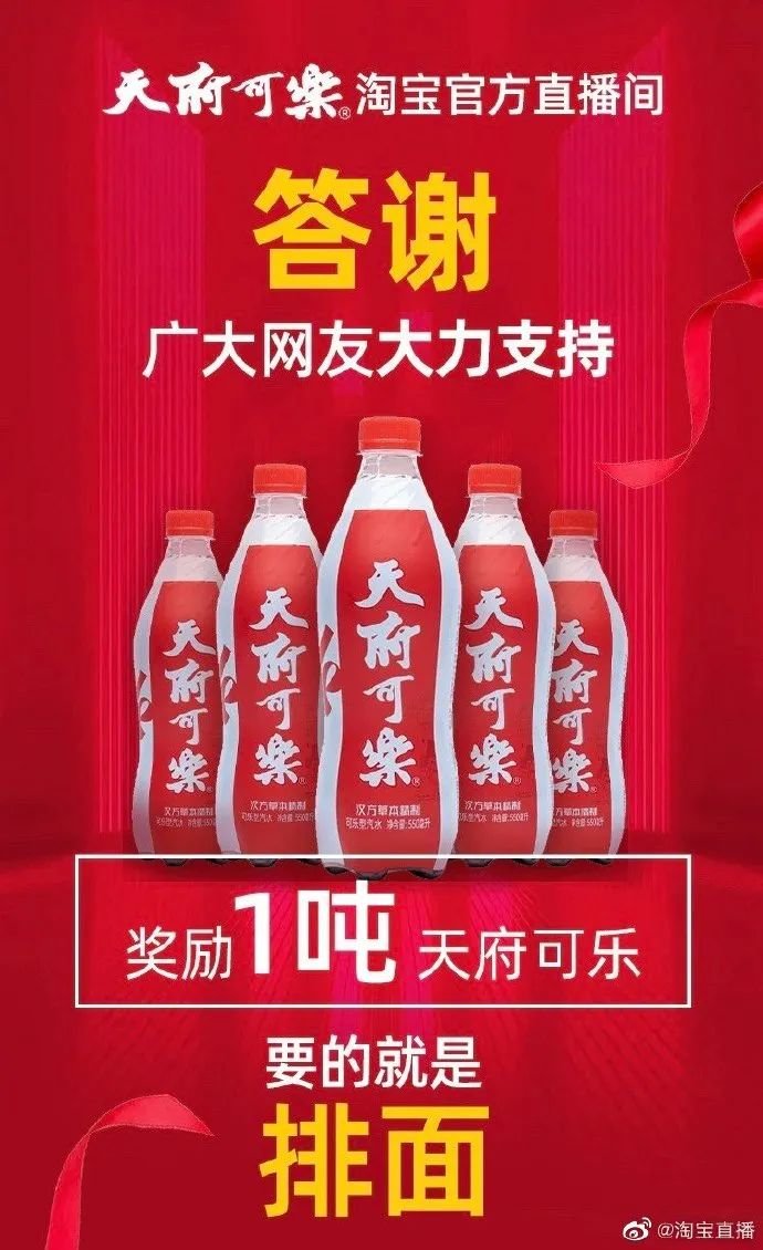 天府可乐呼吁大家理性消费的同时,安排董事长亲上直播间,澄清传言顺便推销带货,收获百万网友围观、销量激增30倍之后,趁势宣布即将推出新品,还为网友准备了感恩回馈活动。