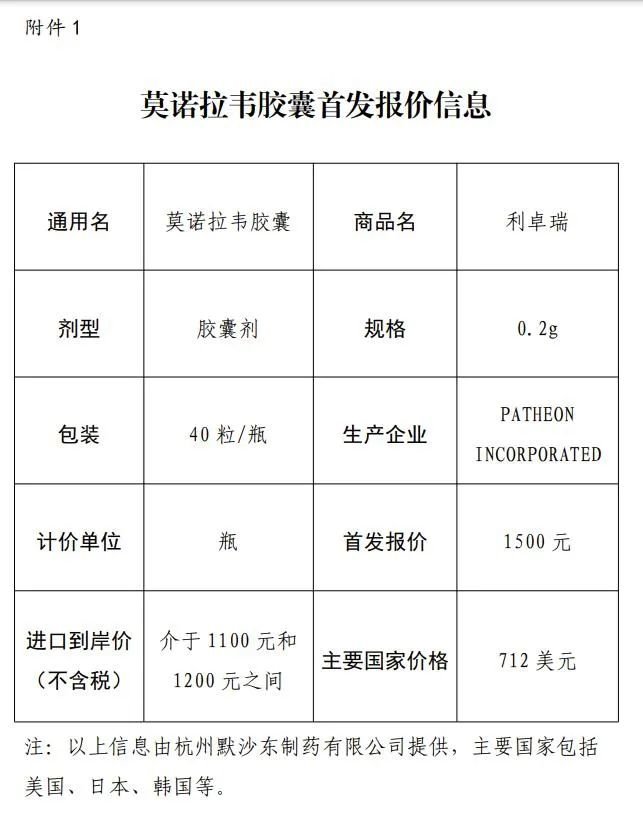 1月10日,天津市医药采购中心发布《新冠治疗药品莫诺拉韦胶囊首发报价公示》,公示显示,莫诺拉韦胶囊首发报价1500元/瓶,40粒/瓶,进口到岸价(不含税)介于1100元和1200元之间,主要国家价格712美元(约合4826元人民币),公示时间为2023年1月10日至1月16日。