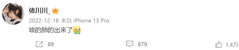 在依川川生前12月18日发出的微博中,发过一条和感染新冠后症状类似的文字,表示自己“咳得肺都要出来了”。