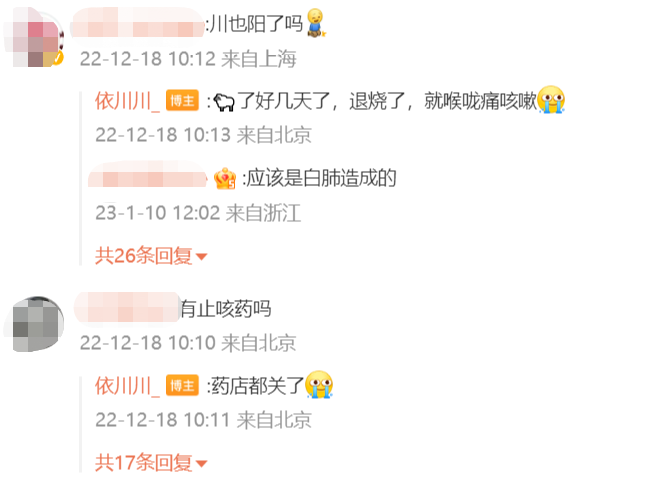 更让人心痛的是,网友问到是否有止咳药的时候,依川川的回复是,“药店都关了”。