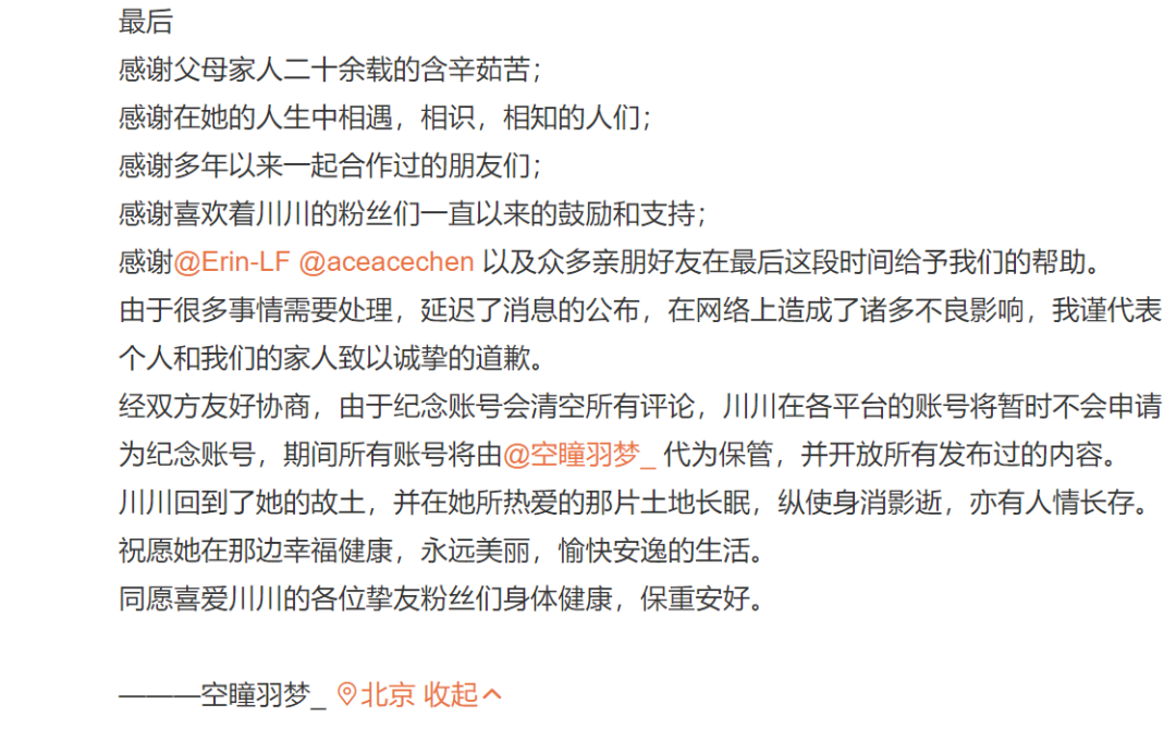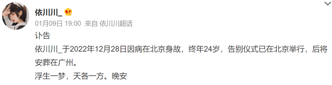 1月9日,这则讣告由@依川川_账号代管人发出。