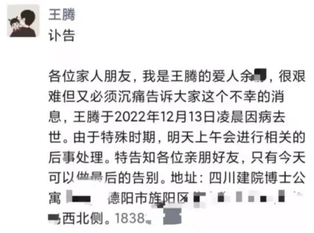 王腾博士的爱人在他的朋友圈发布了这一讣闻。