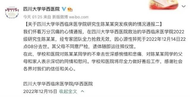 12月14日,四川大学华西临床医学院2022级硕士研究生陈某某,因心源性猝死去世,去世前有发烧症状。