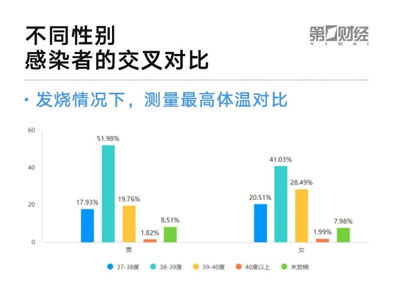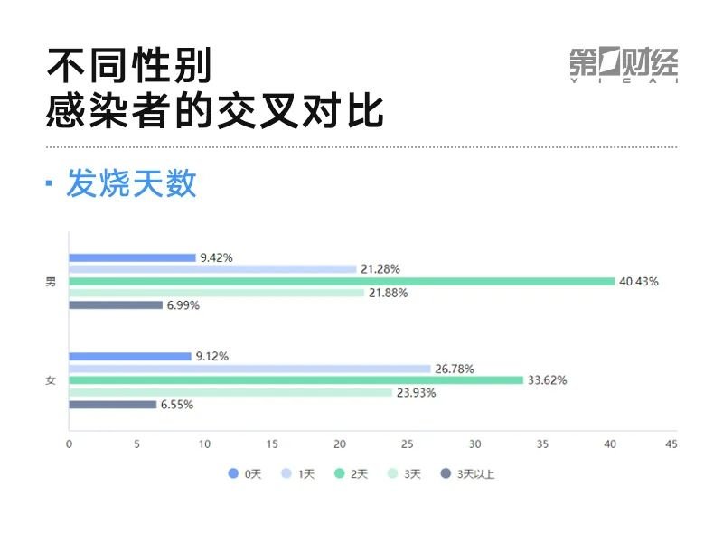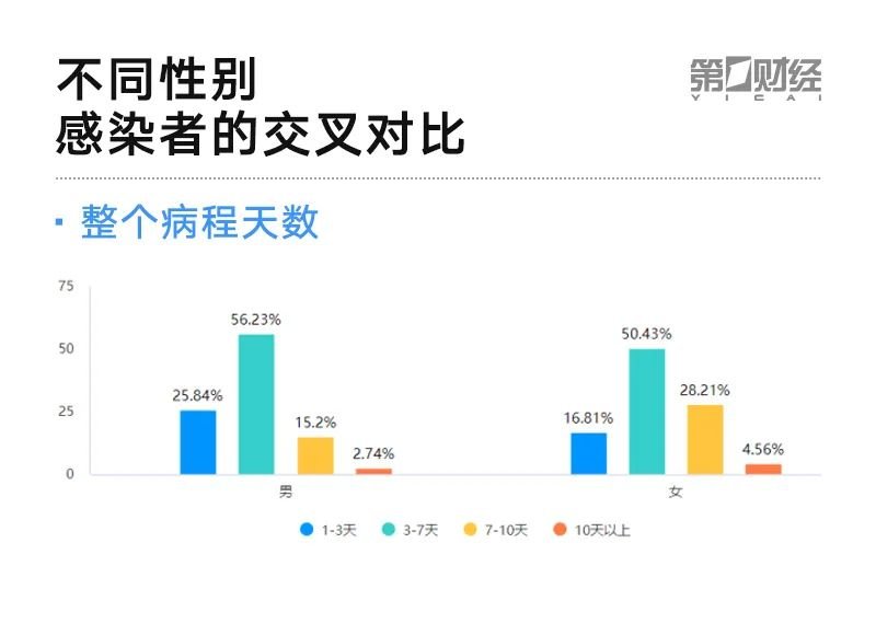 观察数据发现,病程7到10天、10天以上的女性感染者比例高于男性。而女性感染时间也整体长于男性,感染后女性比男性更多出现发烧、咳嗽、嗅觉和味觉障碍等症状,且发烧39-40摄氏度及40摄氏度以上的比例女性高于男性。自述转阴后身体状态中,女性转阴后身体异常比例更高,也表明女性的身体状态恢复较慢。这些应该和女性的自身免疫力有一定关系,还有哺乳期女性和经期女性的特殊身体状态等。