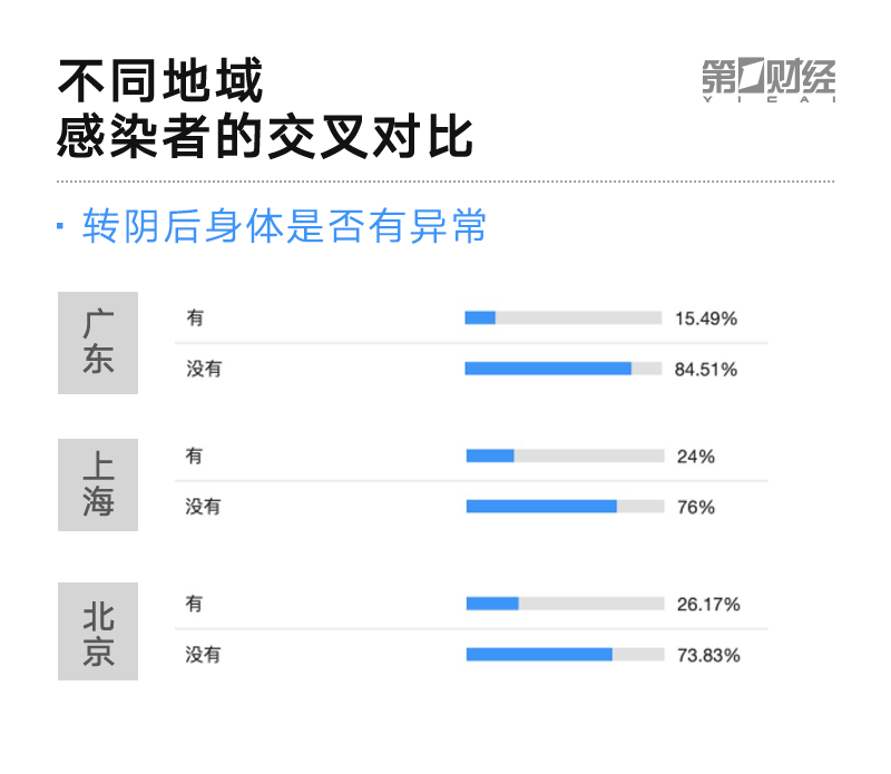 从转阴后身体状态来看,北京超25%的人存在身体异常感觉,广东近15%的人存在身体异常。从转阴后无异常来看,广东地区感染者身体状态更好。