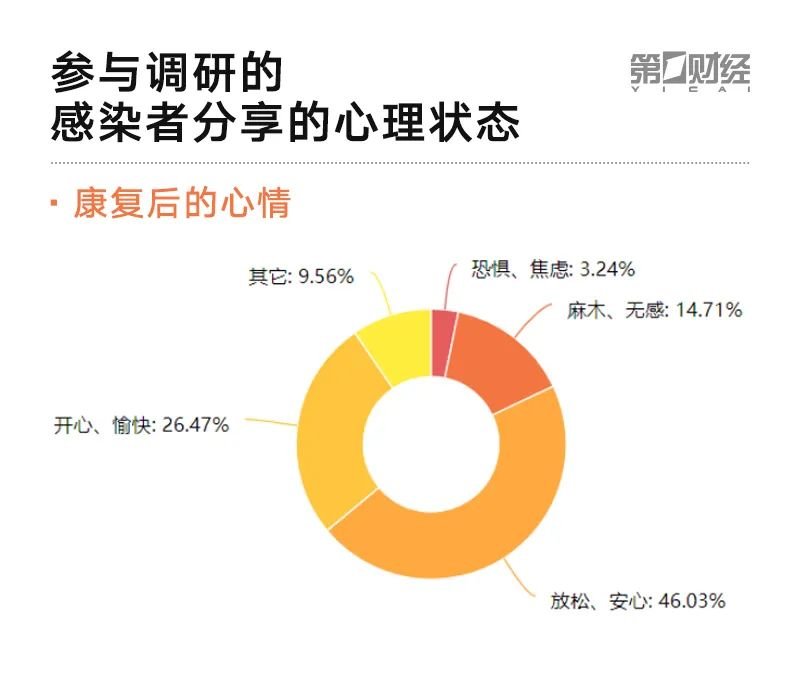 近80%的感染者在康复后表示感到开心、放松、安心,毕竟三年的担心在此次感染后暂时得到了缓解。但是,不少康复后的感染者会留言说担心二次感染、有焦虑感,还有些说自己虽然不阳了,但还要照顾家人,担心家人的健康状态。