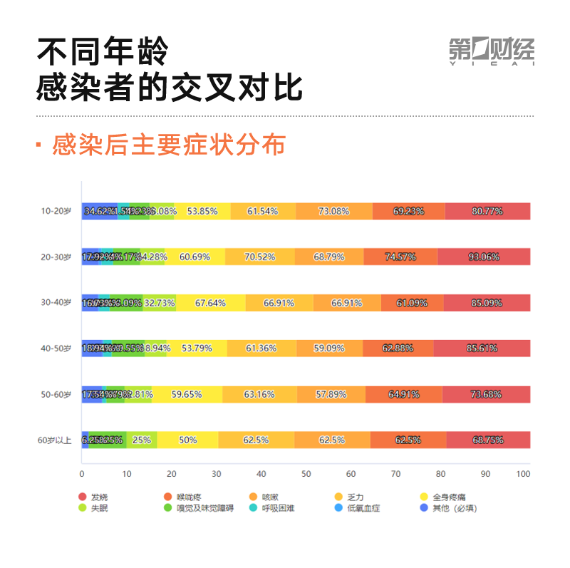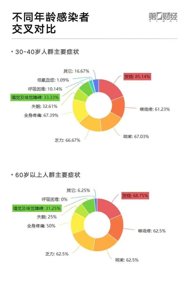 在咽喉痛、咳嗽、乏力等症状表现上,各年龄层比例分布无明显差异,不过在嗅觉和味觉障碍的症状表现上,30-40岁人群出现这一症状比例高达33%,60岁以上人群出现这一症状比例也高达30%,在所有年龄段中仅次于30-40岁人群。