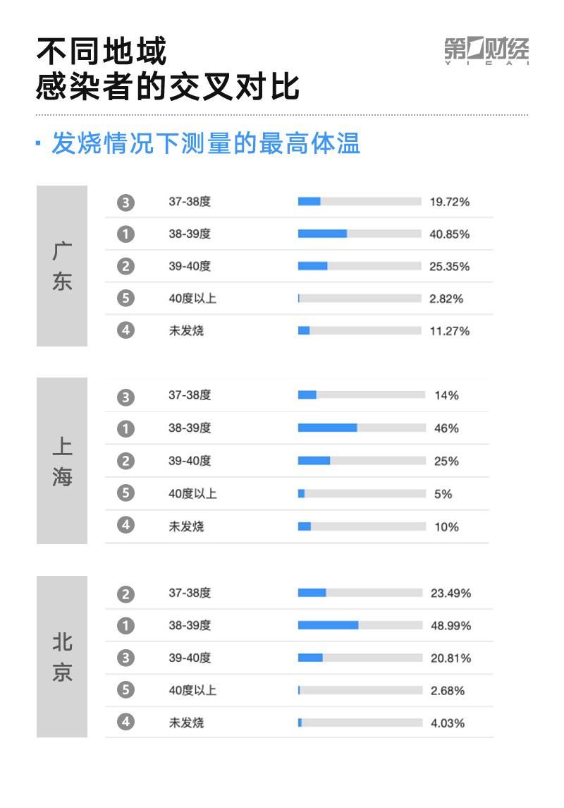 调研结果显示,从感染症状来看,北京、上海出现发烧症状比例更高,广东感染人群出现喉咙痛症状比例更高,其他症状表现上三个地区无明显差异。总的来说,三个地区感染者主要症状表现都在发烧、咳嗽、乏力、喉咙痛、全身疼痛,且发烧情况下,参与调查的感染者所提供的最高测量温度都在38-39度区间。