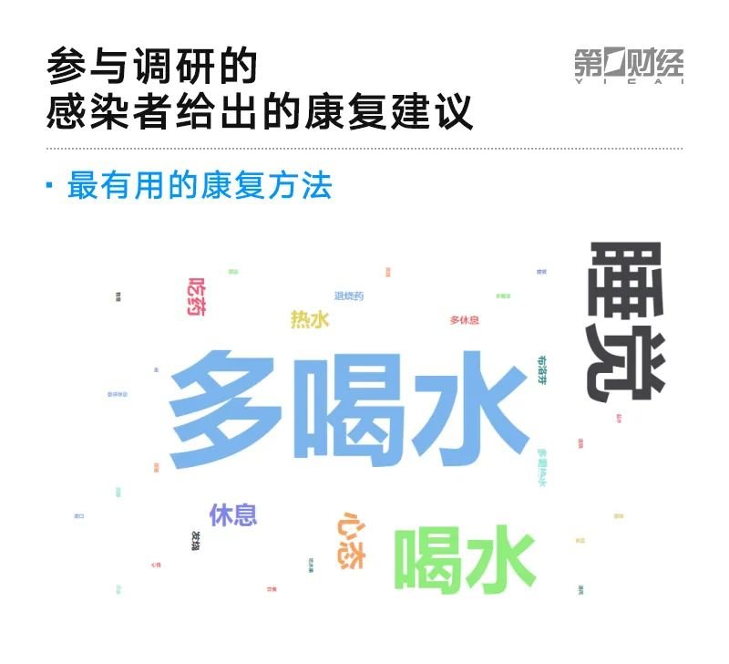 感染者分享最有用的康复方法中,排名前五的分别是多喝水、睡觉、保持良好心态、多休息、吃药。