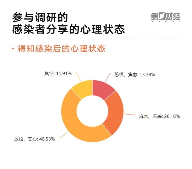 高达48.53%的感染者,在得知感染后处于放松和安心的状态,可见感染前大多数人对于感染的可能性已经有了较强的预见并做好了较充分的心理准备,对感染可以坦然接受,另有26.18%感染者表示麻木无感。恐惧焦虑的占比仅为13.38%。