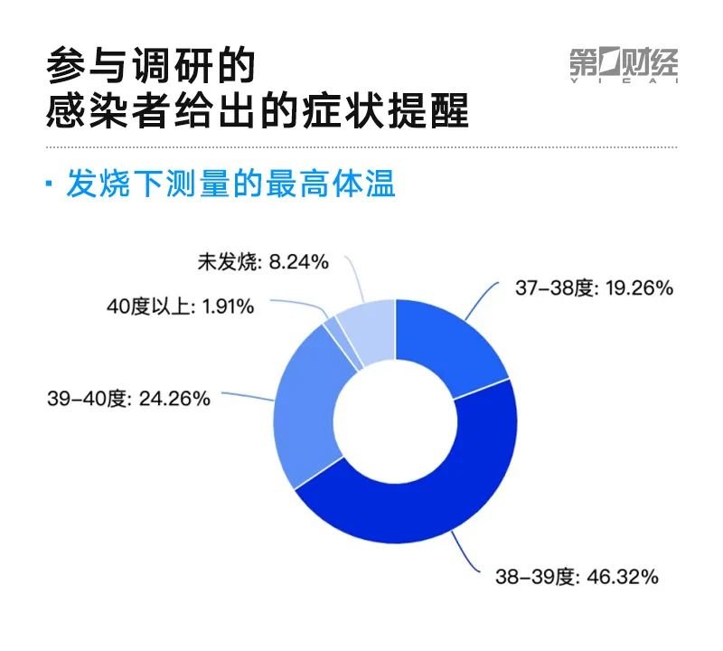 在发烧人群中,近半数测得最高体温在38-39摄氏度。而不发烧的感染者占比也达到近10%,他们的症状更多表现在咽喉痛和咳嗽。