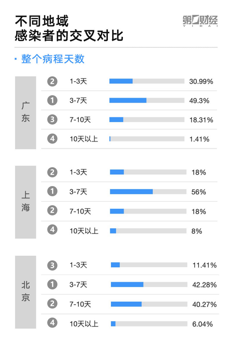 从病程长度上看,北京多数感染者由阳转阴在3-7天和7-10天,上海和广东的感染者多数在3-7天。此外,广东有30%的感染者病程在1-3天,这一比例明显高于上海和北京。