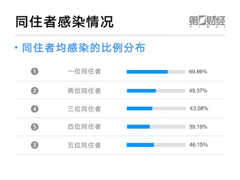 再观察同住者感染率和同住者数量关系,发现在只有一位同住者的情形下,有70%的同住者感染。而随着同住者数量从1位到5位及以上的增加,所有同住者均感染的概率有所下降,但依旧高于部分同住者感染的概率。比如在有5位同住者的调研结果中,5位同住者均感染的占比在46.1%,高于1-4位同住者的感染率。