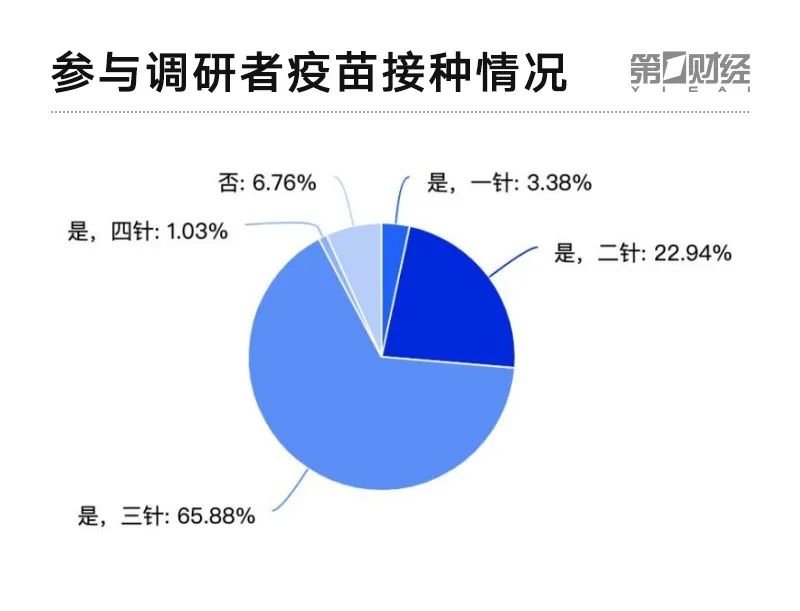 参与此次调研的感染者中,超66%接种过3针疫苗。这个比例稍高于截至今年11月11日全国完成加强免疫接种人口比例。(截至2022年11月11日,全国累计报告接种新冠疫苗34.4亿剂次,完成加强免疫接种8.09亿人,占比总人口约56%。)