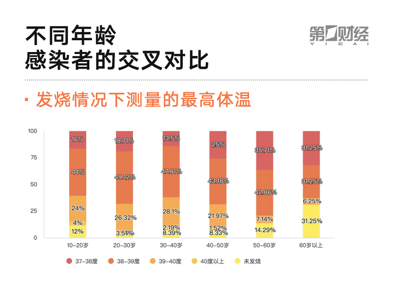 在发烧症状中,60岁以上人群出现发烧症状的比例是在所有年龄段中最低的,但老年人发烧3天的比例较高,年轻人更多发烧在1-2天。在温度表现上,20岁以下的年轻人烧到40度以上的占比略高于其他年龄段人群,50岁以上人群中,超31%最高发烧温度则在37-38度。