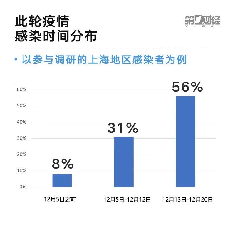 我们根据政策发布时间,分别设定了12月5日、12月13日为两个时间节点,对参与调研的感染者做了一个条件筛选,可以看到参与调研的上海感染者中,感染时间在12月5日之前的占比约8%,在12月5日到12月12日期间占比约31%,有56%是在12月13日到12月20日期间感染上的。
