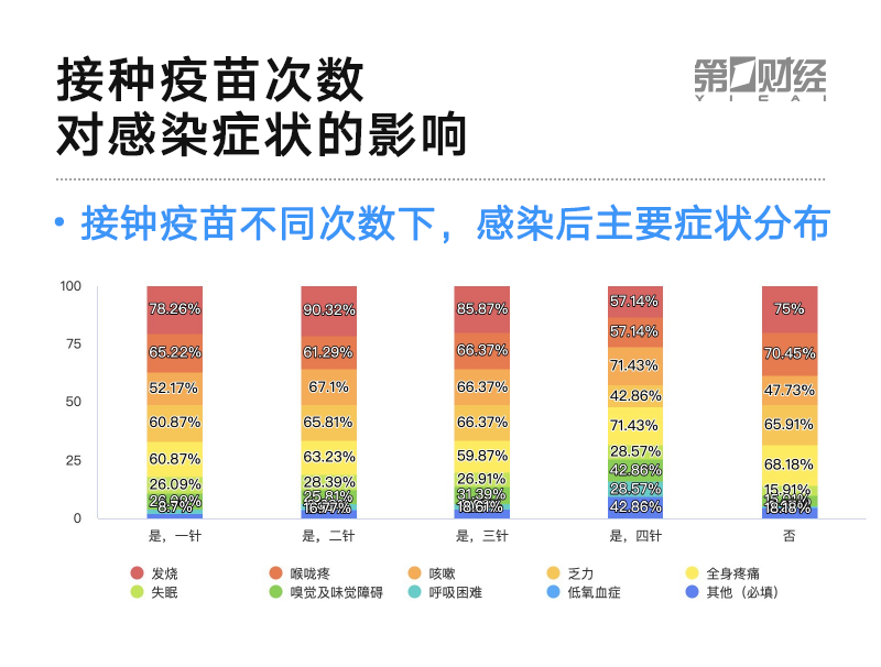 交叉对比接种疫苗情况和感染症状,接种过4针疫苗的感染者中,发烧比例仅57.14%,明显低于整体86%的发烧比例。