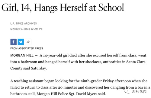 2003年美国一个14岁中学生在学校厕所内用鞋带自缢身亡。