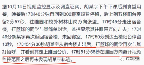 其他细节也支撑胡鑫宇翻墙出去的假设。据媒体报道和发布会,国庆节前,胡鑫宇和同学聊天时曾谈论可以从睢园围墙一角翻越出校等。10月12日、13日,胡某宇曾多次到宿舍楼三楼阳台观望睢园及校外树林山岗方向。