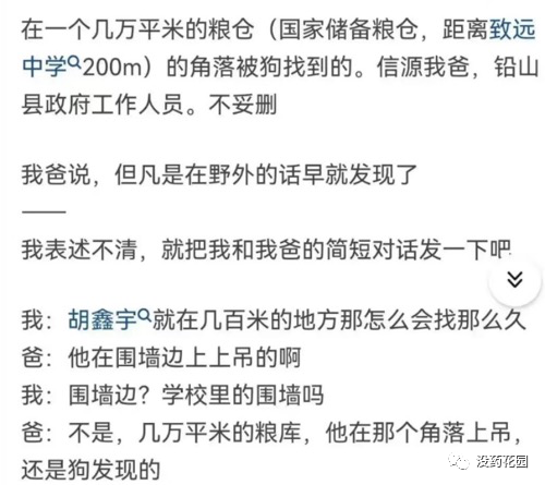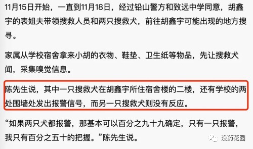 至于大院内的普通狗,并没有受到这样的嗅觉训练。胡鑫宇离地四米多吊在半空,且位于9300平方米的树林深处。而大院面积6万多平方米,如果那两条狗平时在人的居住区活动,不往林子附近去,离得这么远,普通狗闻不到也不奇怪。