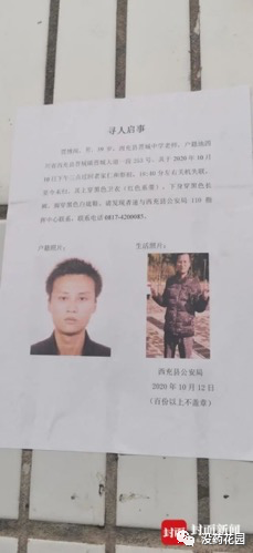 2020年10月10日,四川西充晋城中学39岁的化学老师贾博闻坐车到了山脚下,独自上山失踪,周围民众组织多次大规模搜山,都没有发现他的踪影。