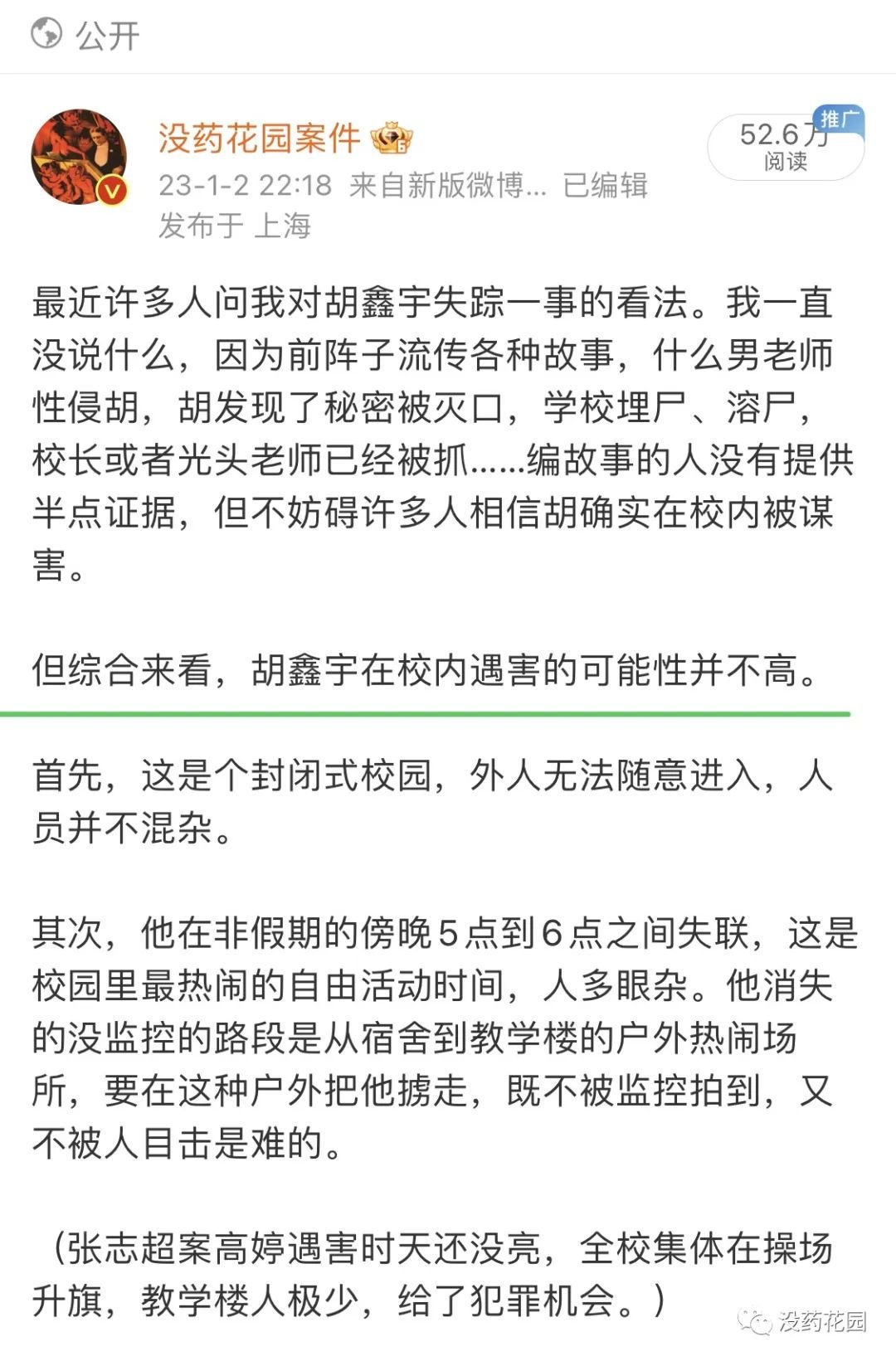 到了12月底,问的人实在太多, 我才在1月2日的微博上顶着锅盖、斗胆说了几点想法:“胡鑫宇在校内遇害的可能性并不高,”并提出他可能那个傍晚自行离校后自杀 (因为一直找不到,当时认为可能是投信江了)。