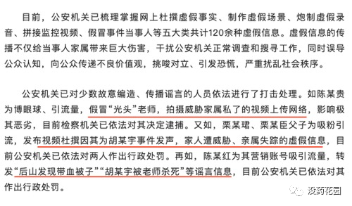 如果你打开某音,上面无数男女老少操着各地口音的普通话,坐在镜头前讲述着警察和家属都不知道的“惊人真相”:“被光头老师杀害”、“被化学老师用药水溶尸”、“被带进医院摘取器官后抛尸河内”、“光头老师删视频曝光”、“男老师性侵胡”、“胡发现老师性侵女生被灭口“、“录音笔里胡求救声曝光”、“校长/班主任/光头老师被抓,已经交代“、”胡被害现场曝光“、“二楼白布裹尸”、“后山发现带血衣被”、“后山发现实验室”、“化粪池发现碎骨”……基本都是高糊无关的画面或者演员演绎,配上引导的文字或者解说。