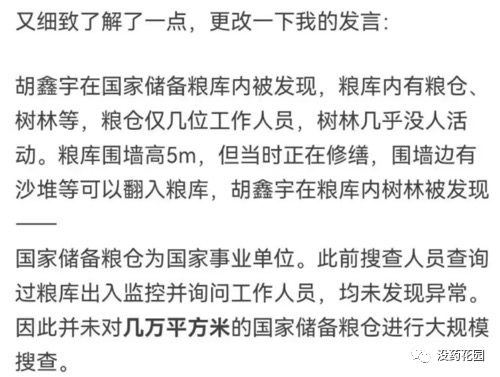 而根据新闻发布会,“该粮库内部主要区域装有视频监控,门口有门卫24小时值守并养有护院犬,未经许可禁止进入,我们先后于2022年10月20日、21日,11月26日、27日开展四次搜寻,对粮库进行了走访,并对全部建筑物内部开展了搜寻,也对粮库旁的玻璃厂废弃厂房进行了搜寻,但胡某宇尸体缢吊地点位于院内约9300平方米树林区域内,未搜寻到位。