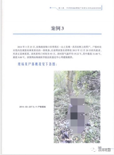 还有个例子就是最近网上都在传的《尸体变化图鉴》中一个案例。2013年12月,海南一个林姓男子在树上挂脖上吊身亡,直到93天后才被人发现。这时长和胡鑫宇的时长也差不多了。值得注意的是,当地气温十分高,平均19度,最高31度,理应腐烂程度更高。而从该案例图片中看,他的脖子依然可以挂在绳子上。
