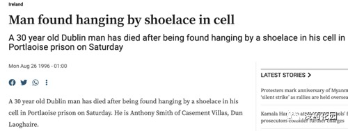 1996年爱尔兰一名30岁男子在狱中窗户栏杆上,用鞋带套脖,自缢身亡。