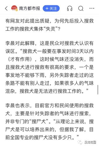 根据《南方都市报》,搜救队队长李晨认为大家对搜救犬的认识有误区。它们要满足特定条件才能起作用,譬如在三天内搜索,这个地方不能下雨,不能有其他人走过、气味混合……
