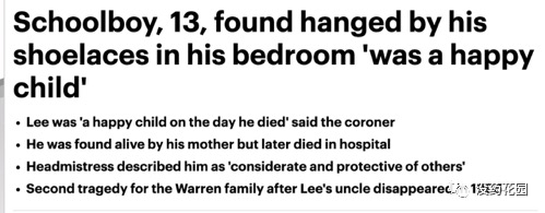 英国一个13岁男孩在自己的卧室用鞋带自缢身亡。
