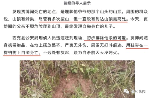 半个月后, 贾博闻的父亲再次独自进山,发现儿子用鞋带在一棵柏树上自缢身亡。 那为什么之前搜山没发现呢?原来当时村民知道山顶有蜂巢,没有搜山的最高处,而恰好他就在那自尽。