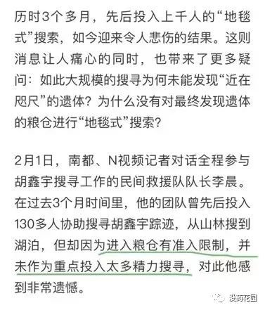 2023年1月28日胡鑫宇的遗体被偶然发现,最初通报说就在金鸡山区域的小树林里缢吊身亡,引起不少网友更大的怀疑:新闻说上千人进山地毯式搜索,这山也不大(大约1000亩左右),怎么会没发现呢?