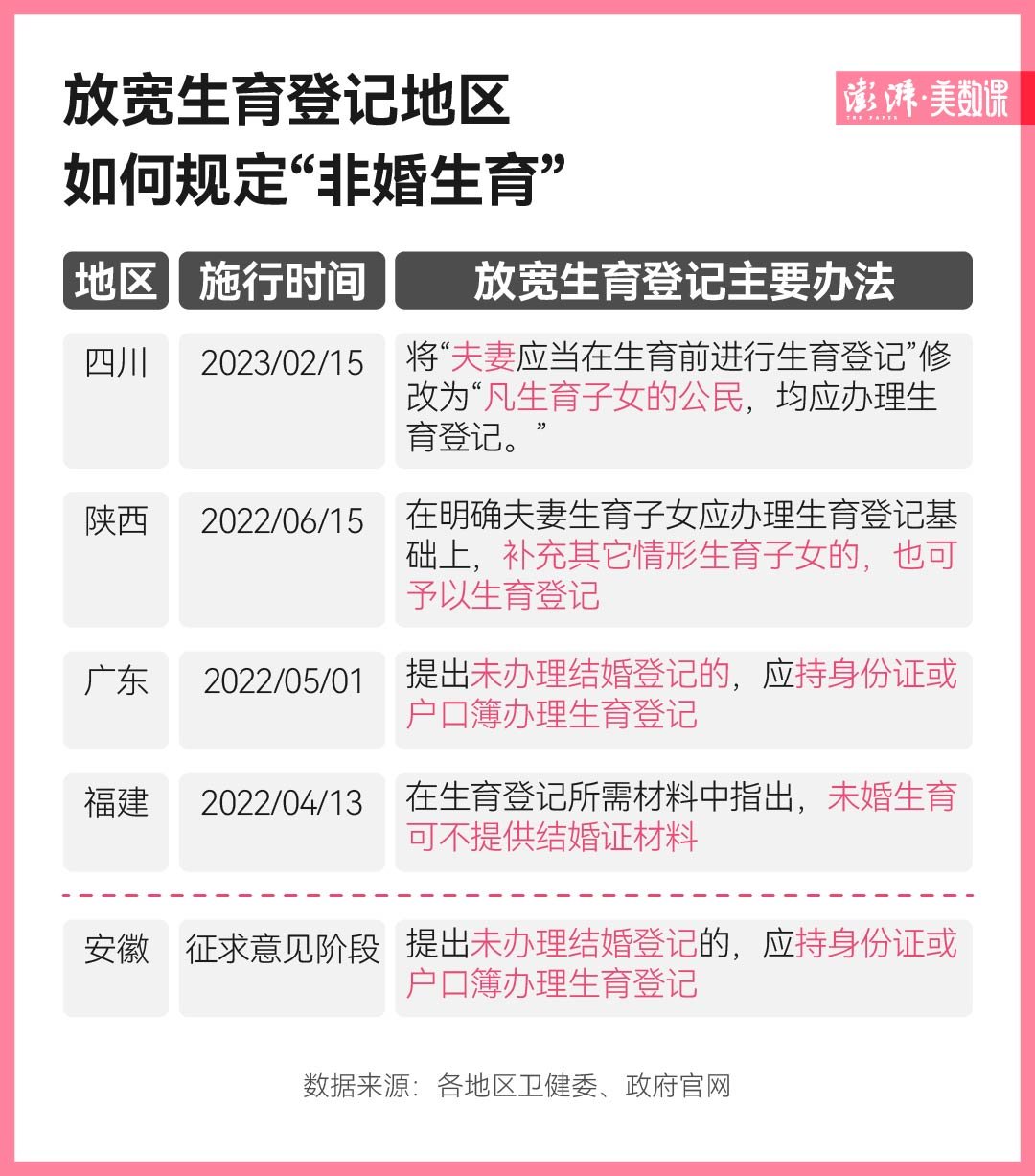 推进生育登记与结婚证脱钩,并非四川首创。陕西、广东、福建等地在2022年便已放宽了生育登记中的结婚限制。此外,川陕粤闽地区均支持非婚生、婚生新生儿落户,但对于非婚生孩子的户口登记有相关材料要求。