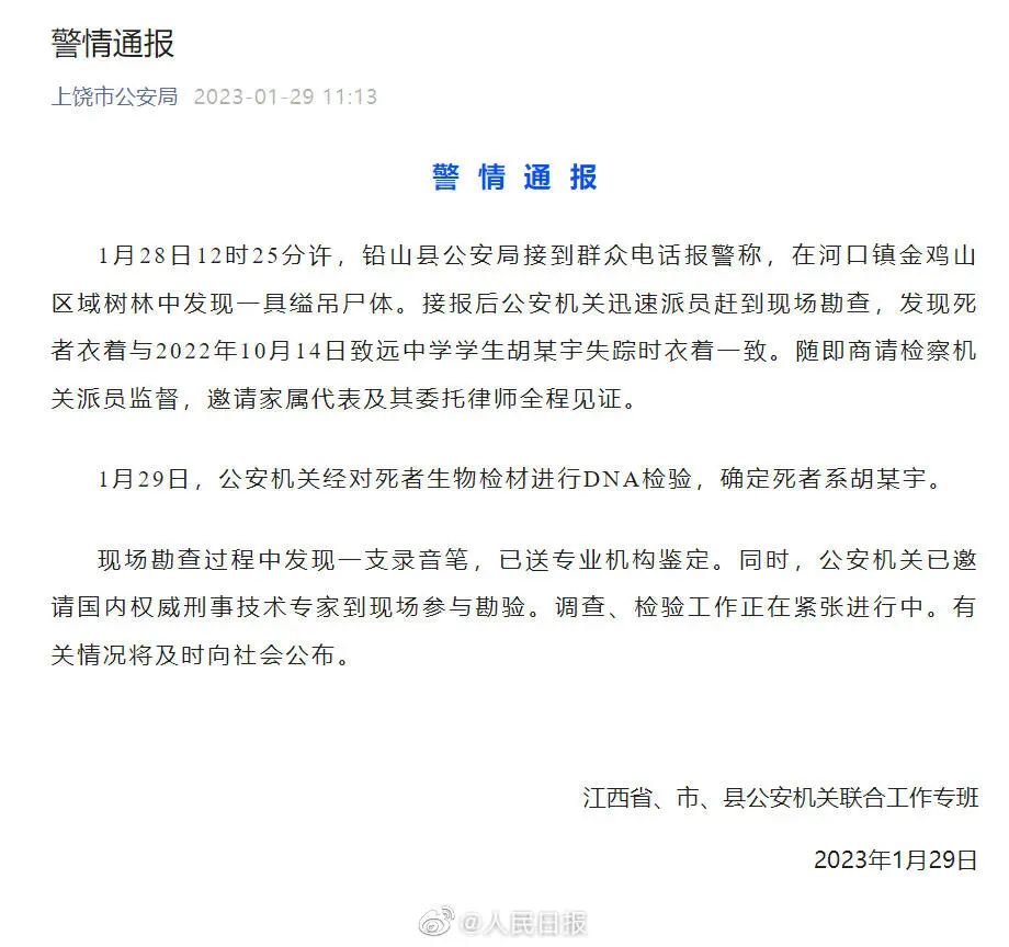 警方赶到后,发现死者衣着和胡鑫宇一致。