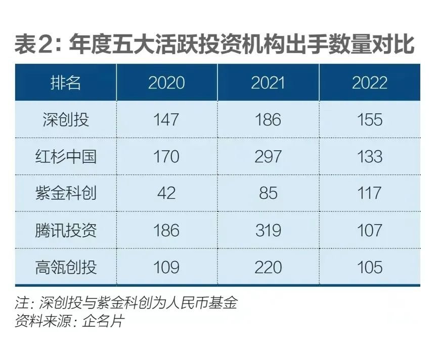 2021年之前,“红高腾”几乎每年都排在中国活跃投资机构前三名,出手数量和金额均领先于其他机构。2022年,中国最活跃的投资机构是人民币基金深创投(深圳市属国企深圳市创新投资集团)。