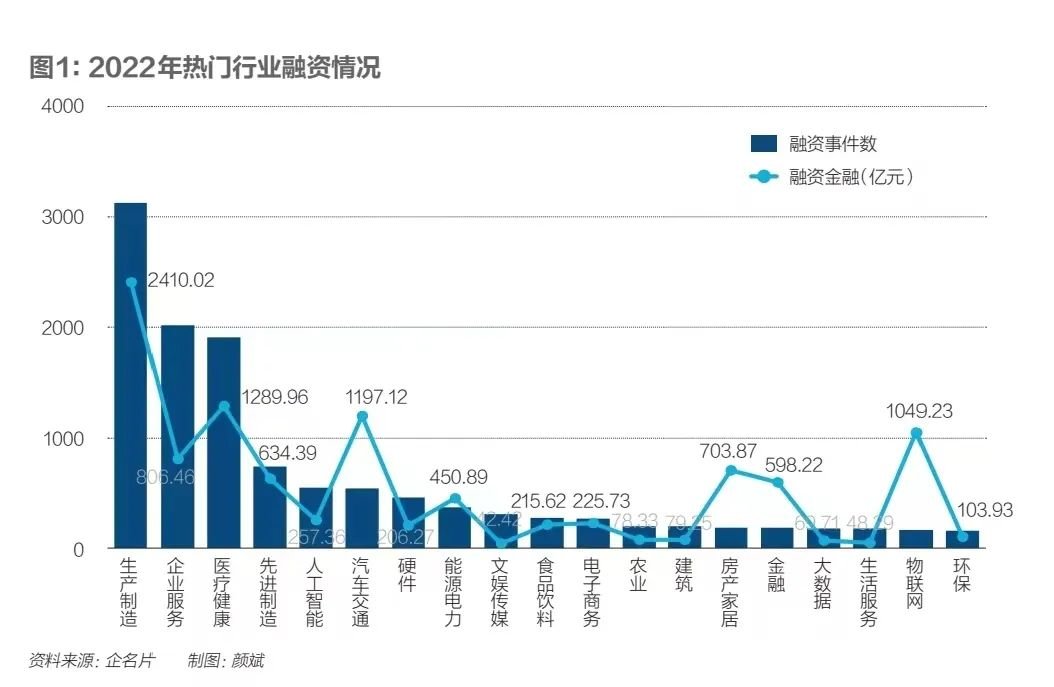 当移动互联网红利期结束,新的周期来到,情况发生了变化。新的趋势是高端制造、新能源、航空航天等。企名片数据显示,2022年全年,生产制造领域的融资数和金额都遥遥领先,共完成3118笔融资,总金额2411亿元,占全年一级市场融资总额的20.6%。其次是企业服务、医疗健康和先进制造。