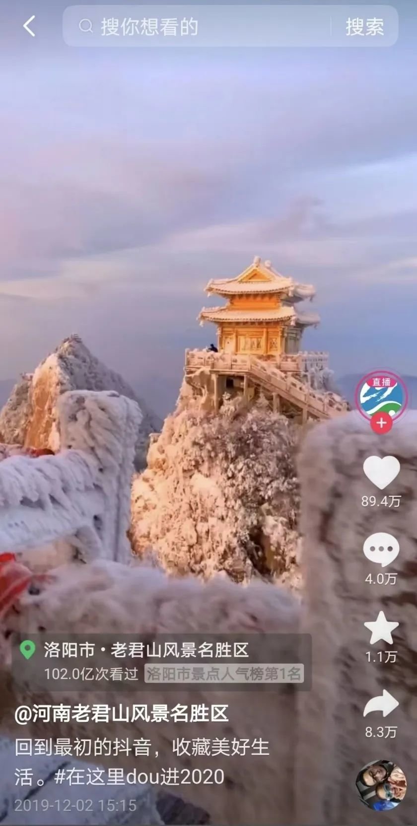 老君山文旅集团副总经理张鹏远曾在接受媒体采访时称,老君山运营的抖音官方账号2019年播放量达5.3亿次。根据抖音数据报告,洛阳老君山成为2019年抖音播放量最高的十个景点之一。