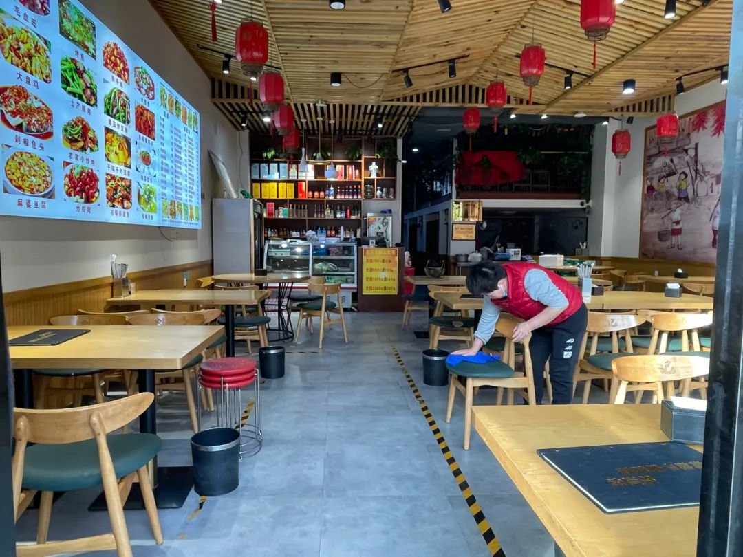 一家饭店的老板正在打扫卫生,中午即可堂食